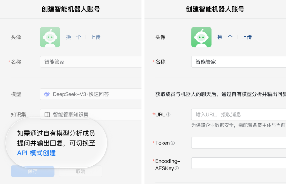 - 支持通过 API 模式创建,用于对接企业的自有模型和数据,使用更灵活。