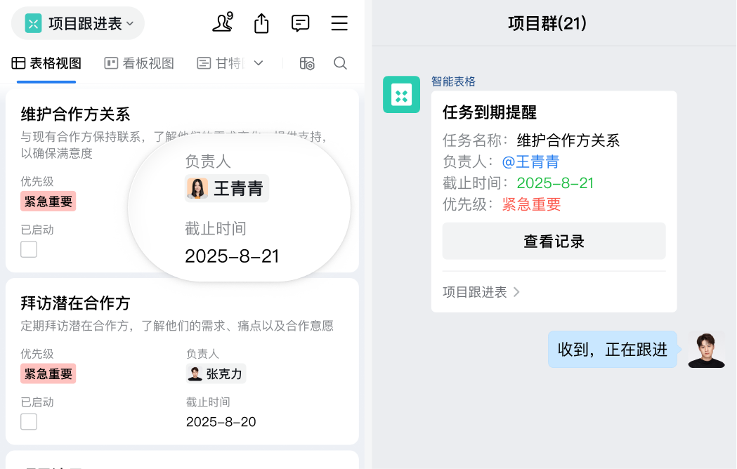 - 任务状态有变化,智能表格还可以自动在项目群里发消息 @负责人 提醒。