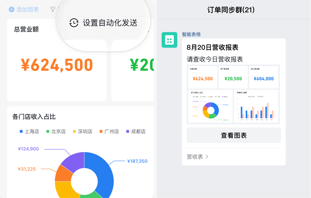 - 支持设置自动化提醒,定期将仪表盘发送到群聊,拿出手机就能随时掌握业务进展