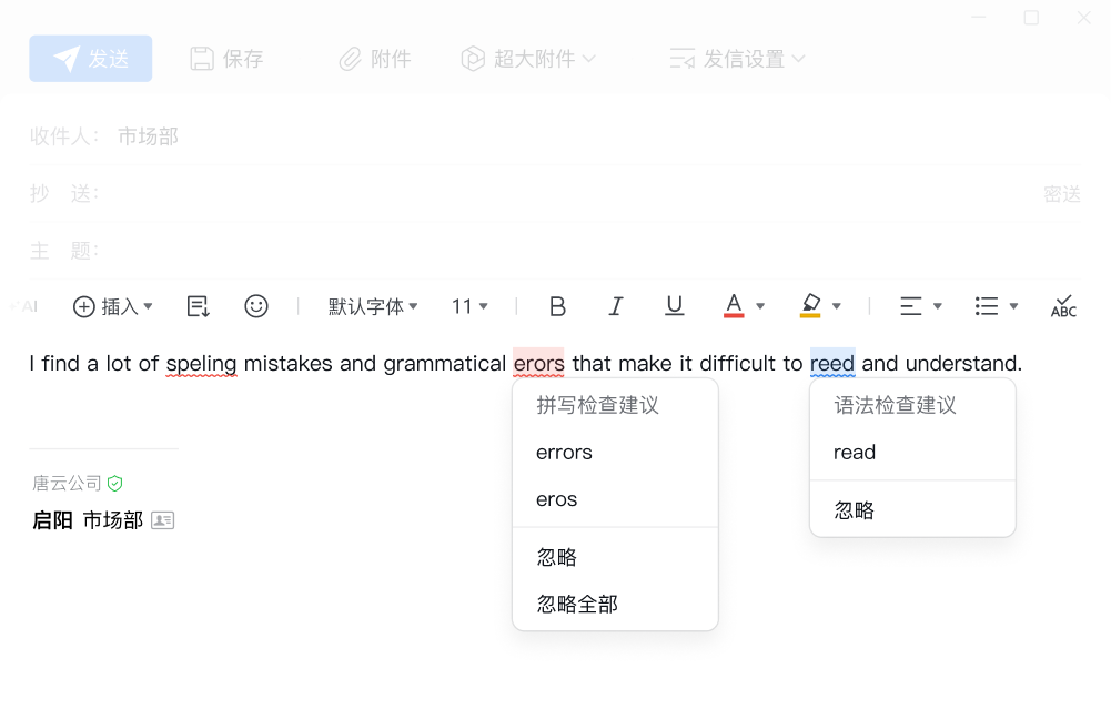 - 写英文邮件时,可以实时检查英文单词拼写错误和语法问题并给出修改建议。