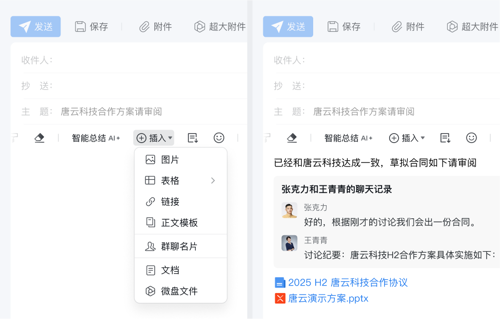 - 在邮件中可插入聊天记录、文档、日程等,也可将文档内容添加至邮件正文中,方便将已有的工作内容一键添加至邮件正文。
