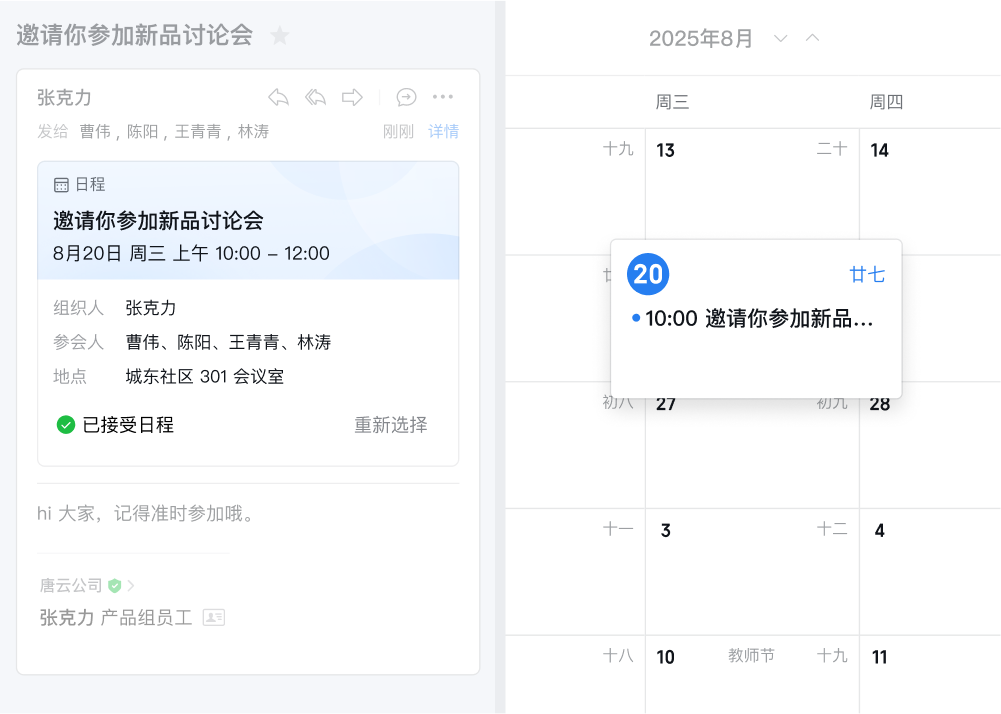 - 通过邮件发送会议邀请,会议信息会自动添加至参会人的日程;会后也可将 AI 总结的会议纪要,用邮件发送给参会人。