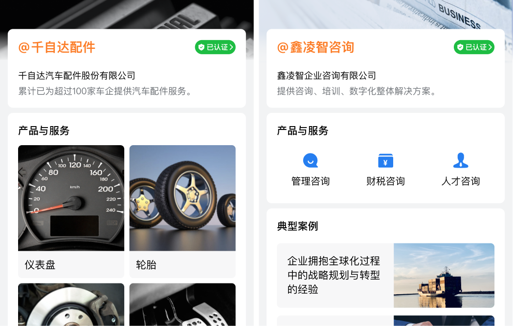 - 企业可按行业选择模板,完善产品 / 服务、客户案例、荣誉资质等信息,展现企业实力。