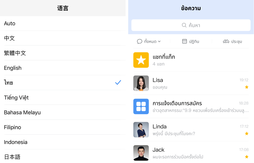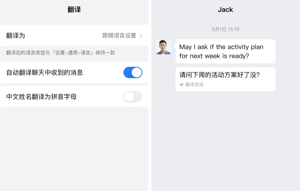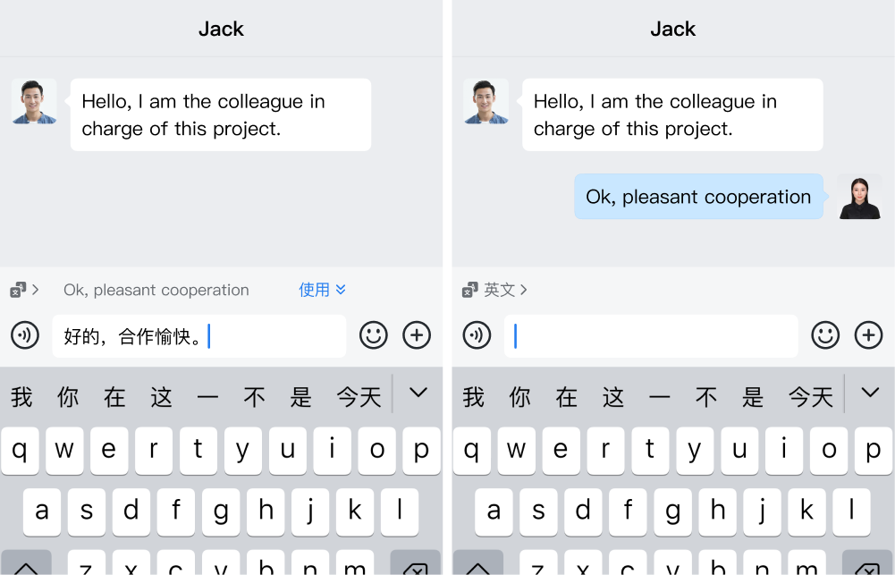 - 聊天中支持边写边译,实时翻译为英语、日语、泰语等 6 种语言,无需切换翻译工具。