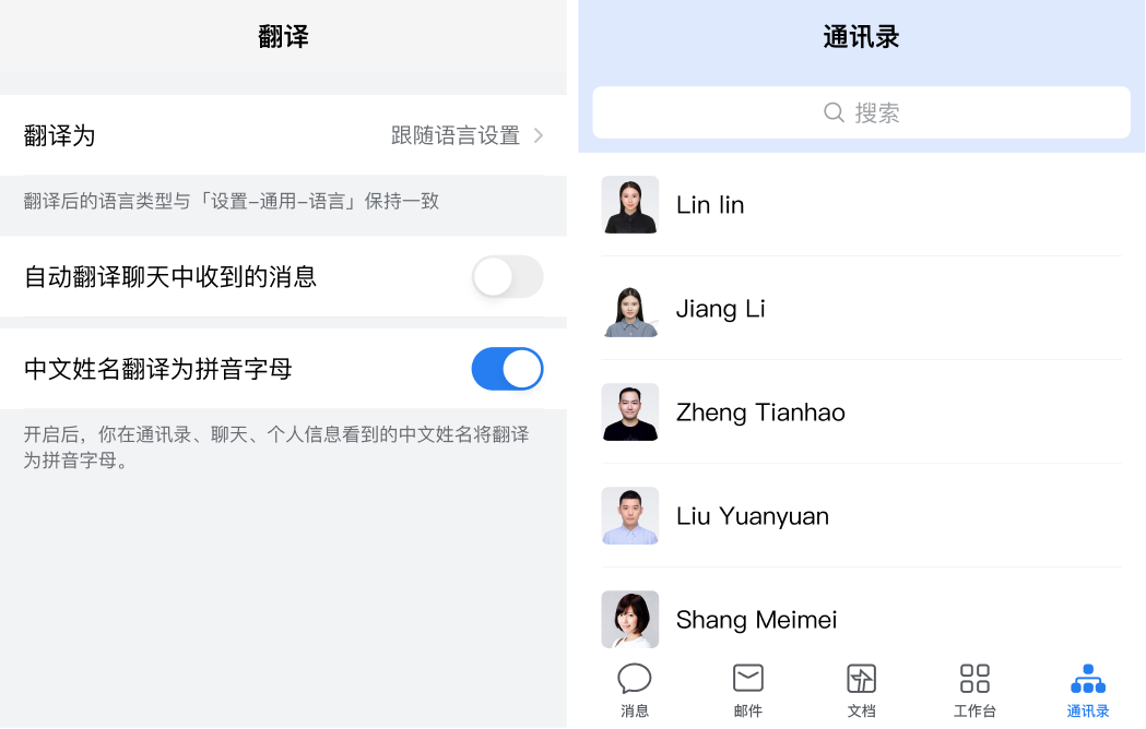 - 境外成员可通过拼音字母查看中文姓名,联系中国同事更便捷。