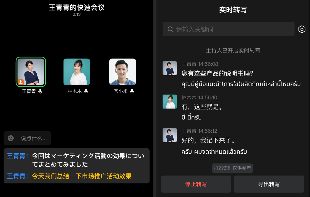 - 会议字幕和文字转写可翻译为 17 种语言,帮助参会者理解和记录会议内容。