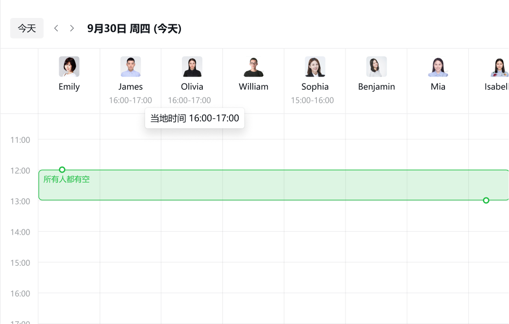 - 新建日程或预定会议时,可以看见与自己不同时区同事的当地时间,跨时区协作更方便。