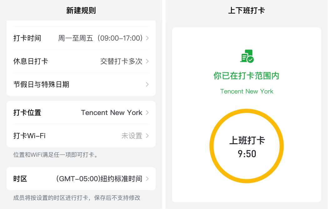 - 创建打卡规则时,可选择境外地点和时区。成员可在境外地区使用打卡。