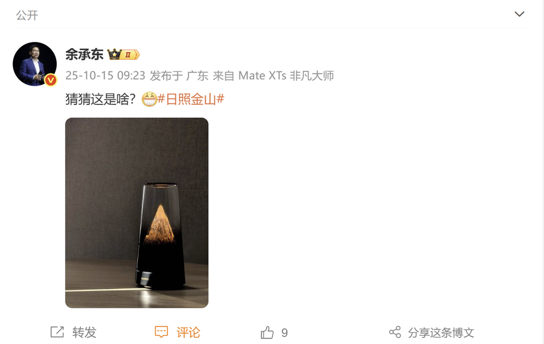 10月15日消息,华为常务董事、终端BG董事长余承东在个人社交账号发布一则动态,引发外界广泛关注。他在文中晒出一张新品外观形态图,并配文“猜猜这是啥?日照金山”,迅速在科技圈和社交媒体平台激起热议。