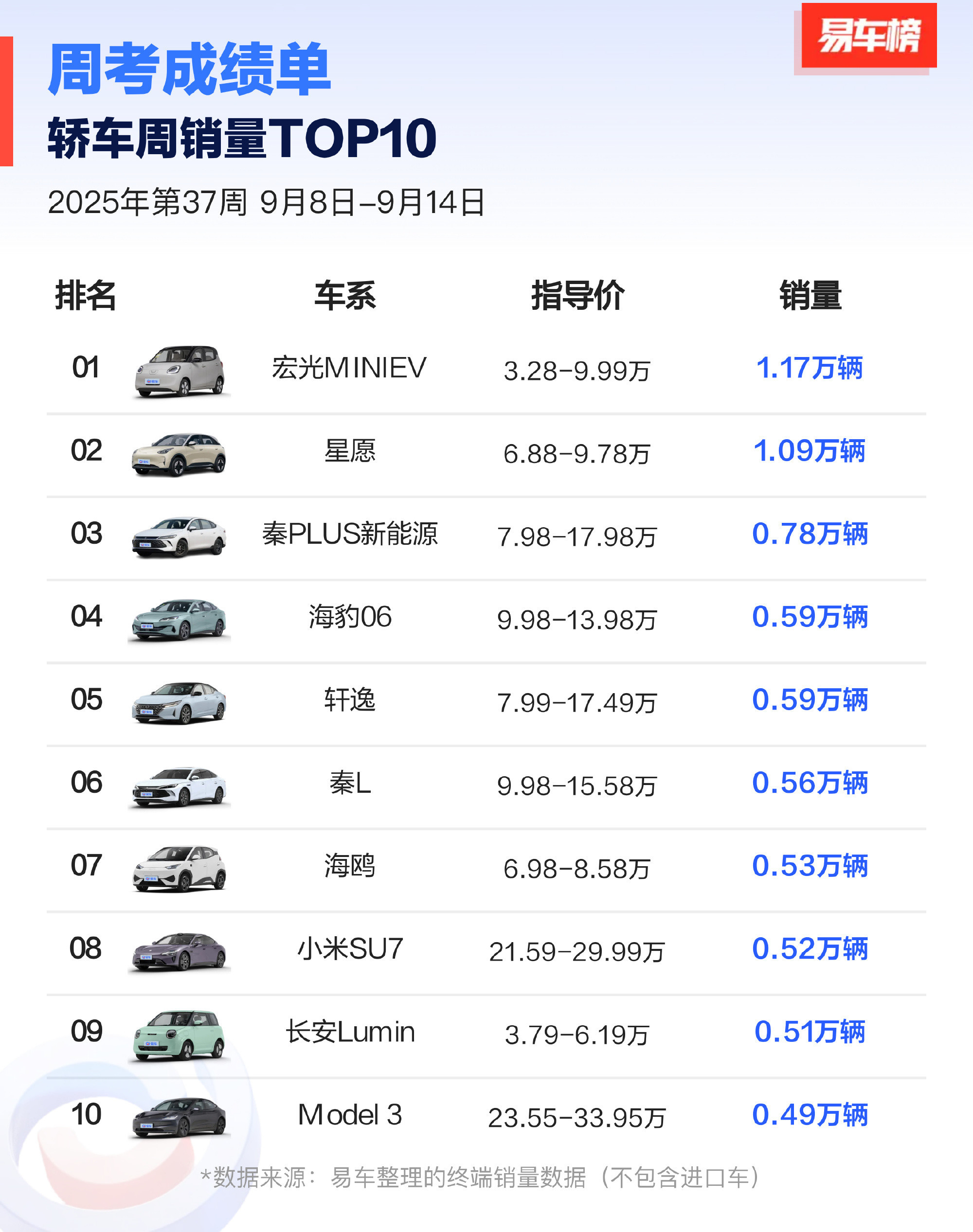 【CNMO科技消息】近日,易车整理了2025年第37周(9月8日-9月14日)中国汽车市场的终端销量数据(不包含进口车),列出了目前销量最高的10款SUV车型:
