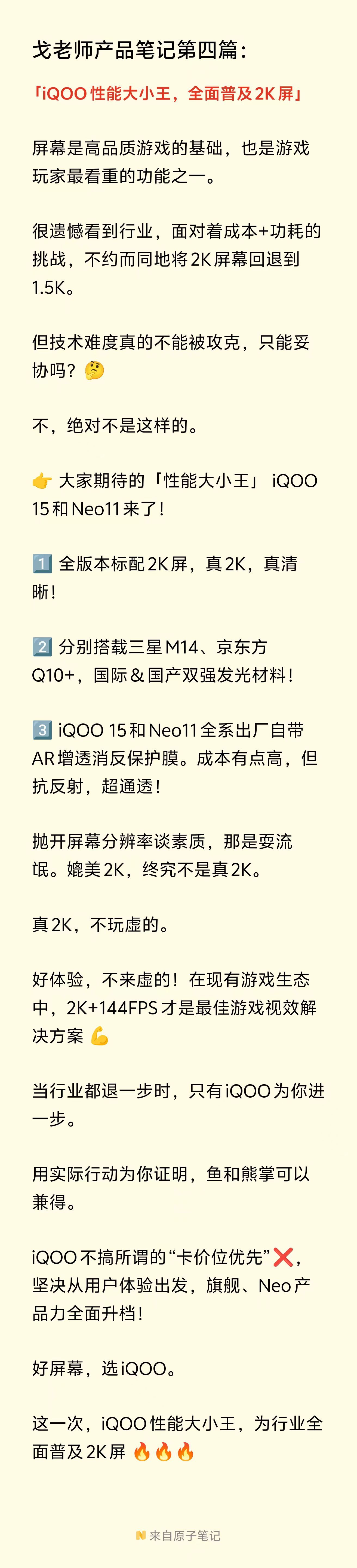 IT之家 10 月 14 日消息,iQOO 产品经理 @戈蓝V 今日发布“戈老师产品笔记第四篇”,宣布 iQOO 性能大小王(即 iQOO 15 / Neo11 手机)将全面普及 2K 屏: