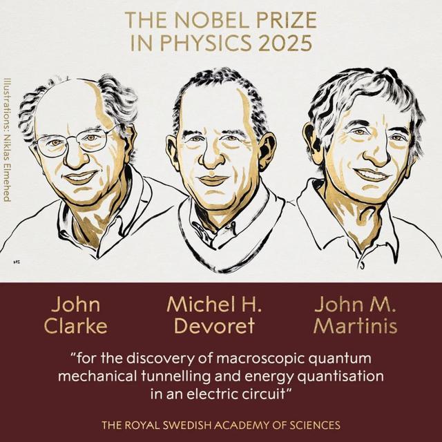 综合央视新闻、人民日报客户端刚刚发布的消息,当地时间10月7日,瑞典皇家科学院决定将2025年诺贝尔物理学奖授予科学家约翰·克拉克、麦克·H·德沃雷特、约翰·M·马蒂尼,以表彰他们“发现电路中的宏观量子力学隧道效应和能量量子化”。
