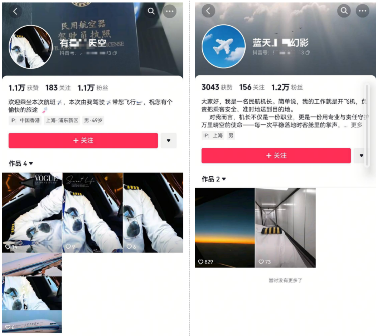 假冒飞行员人设的涉诈账号,目前均被封禁。图源 抖音