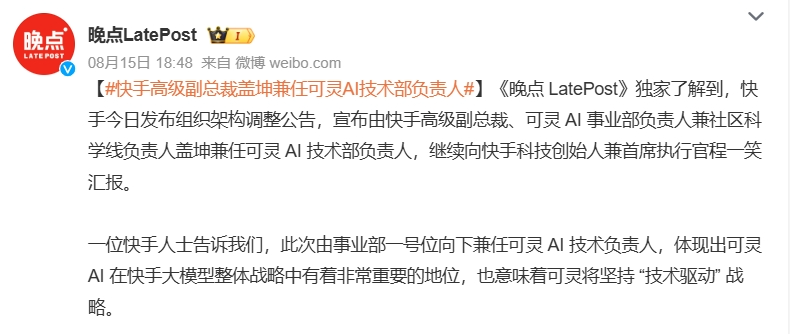 今年8月,快手高级副总裁盖坤出任可灵AI技术部负责人;这位算法研究出身的负责人极为重视可灵的模型效果。盖坤还提到,未来要进一步聚焦P端(专业创作者)付费订阅会员。
