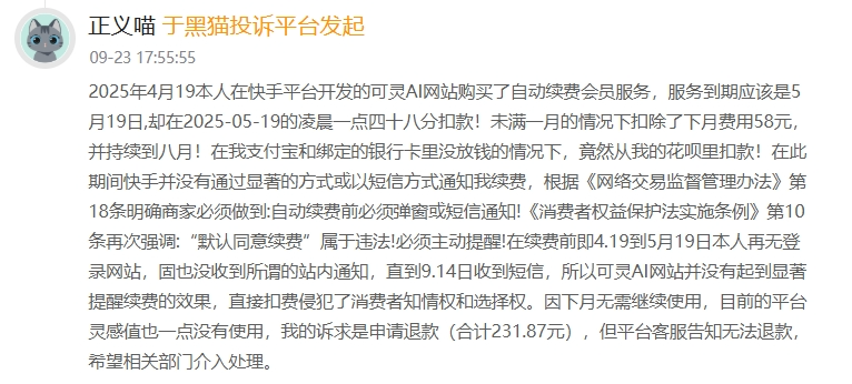 近期有消费者在“黑猫投诉”称,其于4月19日在可灵AI网站购买了自动续费会员服务,服务到期应该是5月19日,却在19日的凌晨提前扣款,“未满一月的情况下扣除了下月费用58元,并持续到八月!在我支付宝和绑定的银行卡里没放钱的情况下,竟然从我的花呗里扣款!在此期间快手并没有通过显著的方式或以短信方式通知我续费。”