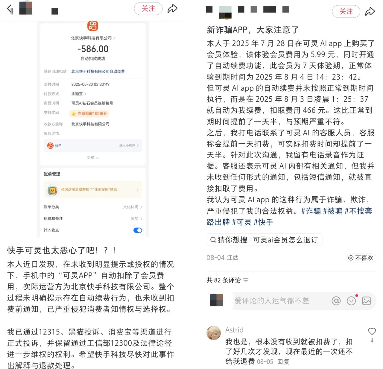 “趣解商业”注意到,有不少用户在社媒平台吐槽可灵在没有通知的情况下自动扣会员费;而且还有用户称可灵会在会员到期之前提前扣费,甚至直呼可灵是“新诈骗APP”。