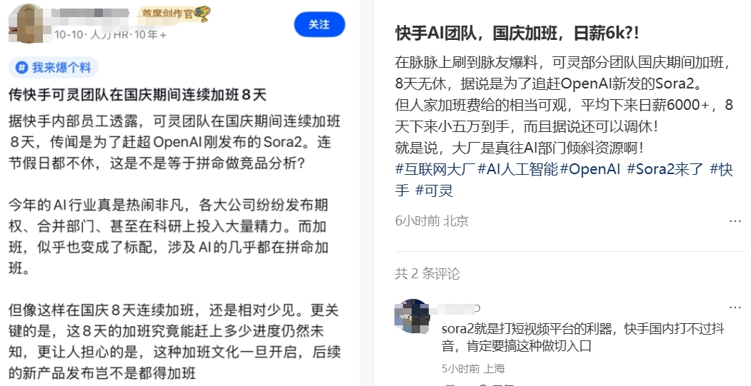 如今,Sora的爆火已经给国内视频生成市场带来不小的变化,可灵的产品策略很可能也会受到影响。有网友爆料称,Sora2发布后,快手可灵部分团队被叫回来加班,国庆8天无休。