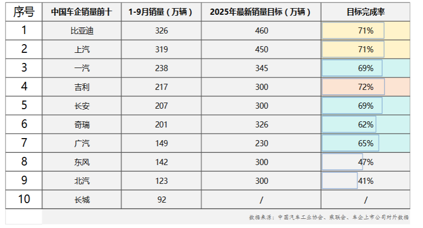 从销量梯队来看,比亚迪与上汽集团组成第一梯队,1-9月累计销量均突破300万辆,成为行业“双巨头”。其中比亚迪以326万辆的累计销量稳居榜首,其全年最新销量目标为460万辆,目前完成率已达71%。作为新能源领域的领军企业,比亚迪凭借刀片电池、DM-i超级混动等核心技术,以及覆盖轿车、SUV、MPV的全品类产品矩阵,持续巩固市场优势,新能源车型销量占比不断提升,成为拉动整体销量增长的核心动力。上汽集团同期累计销量达319万辆,全年目标完成率同样为71%,在保持燃油车市场稳步推进的同时,加速布局新能源领域,旗下荣威、MG等品牌的新能源车型销量持续攀升,“燃油+新能源双线并行”策略成效显著,保障了整体增长的稳健性。