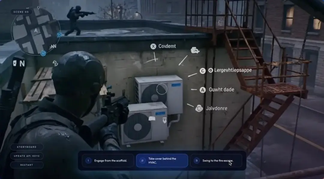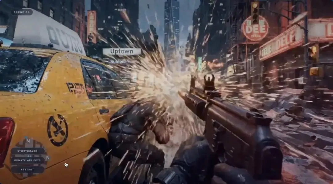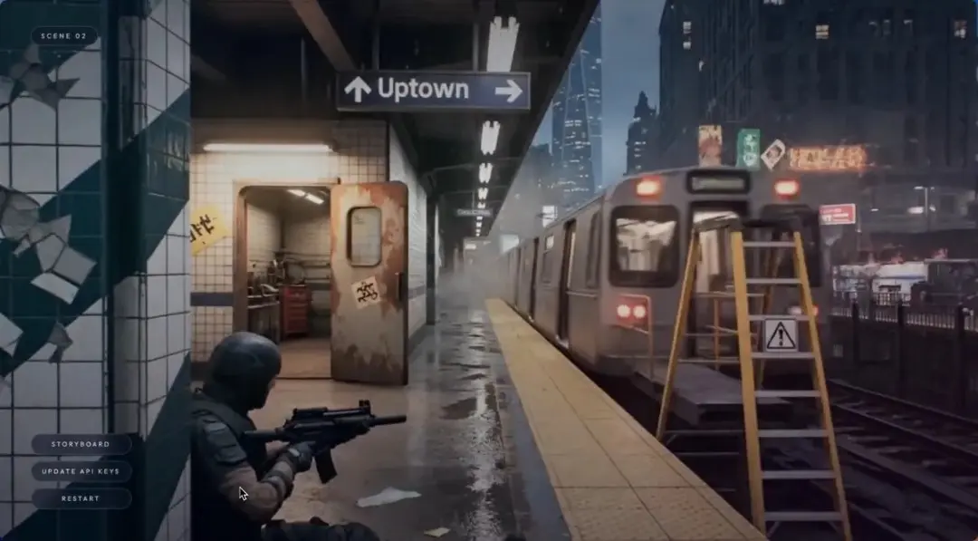 我们跟着小队沿街推进。曳光弹嗖嗖飞过,却看不到开枪的人。途中经过一家店铺,招牌上的字一会儿是“DELI”,一会儿是“DELE”,一会儿又变成“DEE”,全是AI生成的错误拼写。前方看似有个地铁入口,标识却写着“Sublone”,而且台阶居然是向上延伸的。走近后,屏幕底部突然弹出三个选项——原来我们瞬间进入了“选择导向”玩法,可选择“潜入上城地铁”“从公交车后向百老汇推进”或“右转,爬上消防梯”。