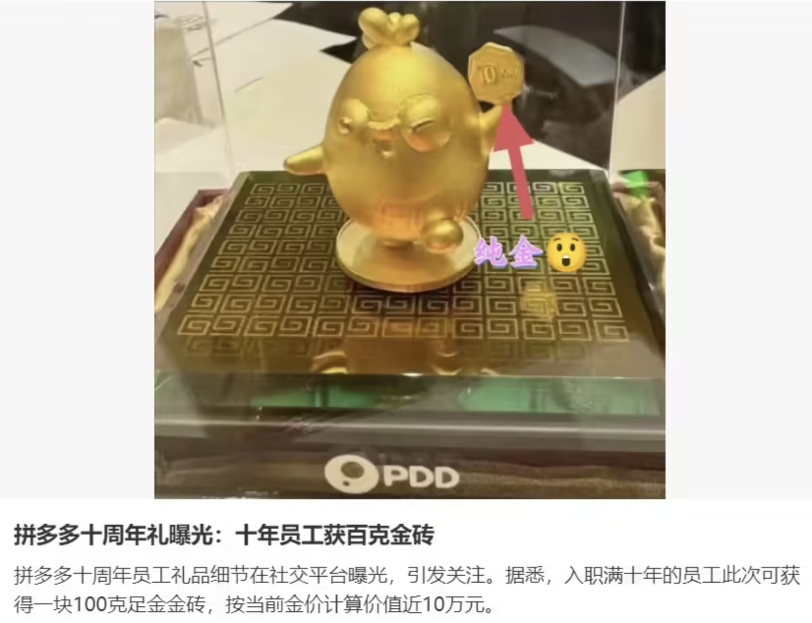 10 月 23 日,拼多多向员工发放金戒指、「金鸡」等周年纪念礼的消息近期引发关注。
