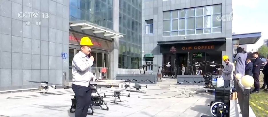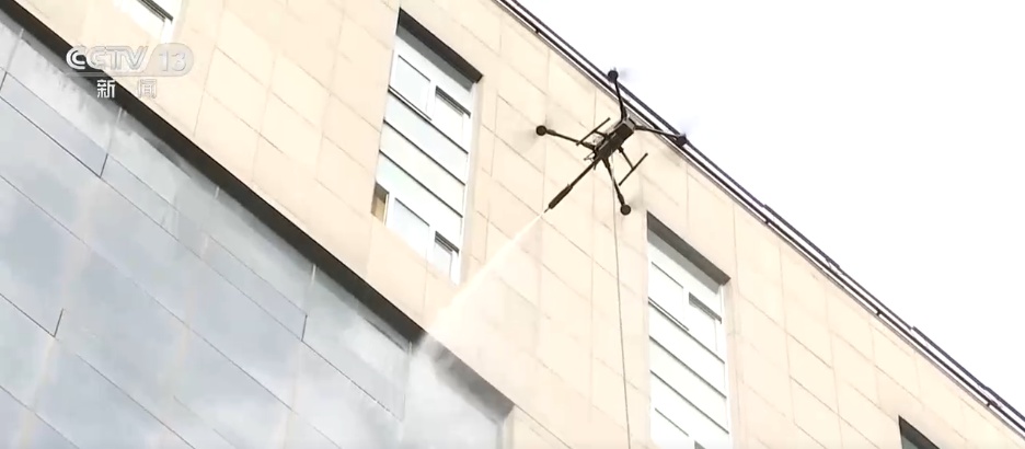 在陕西西安航天基地,无人机飞手操作幕墙清洁无人机,接通水管后依次完成打湿玻璃、清洁剂清洗、二次冲洗流程,不到半小时便清洁完200多平方米的幕墙。高空清洗无人机应用方案由当地企业研发,是将光伏电站无人机清洗经验延伸至城市建筑运维的创新实践,破解了传统人工作业高危、低效等难题。工作人员介绍,用无人机清洗,半个小时就可以清洗干净,但是人工清洗可能需要花费一天,效率能提高五到二十倍。