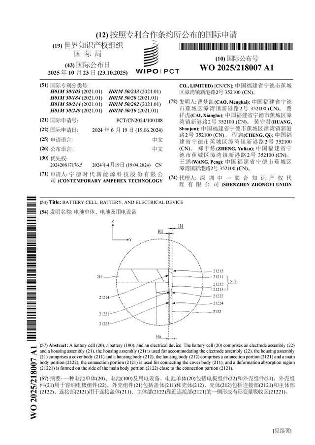 证券之星消息,根据企查查数据显示宁德时代(300750)公布了一项国际专利申请,专利名为“电池单体、电池及用电设备”,专利申请号为PCT/CN2024/100188,国际公布日为2025年10月23日。
