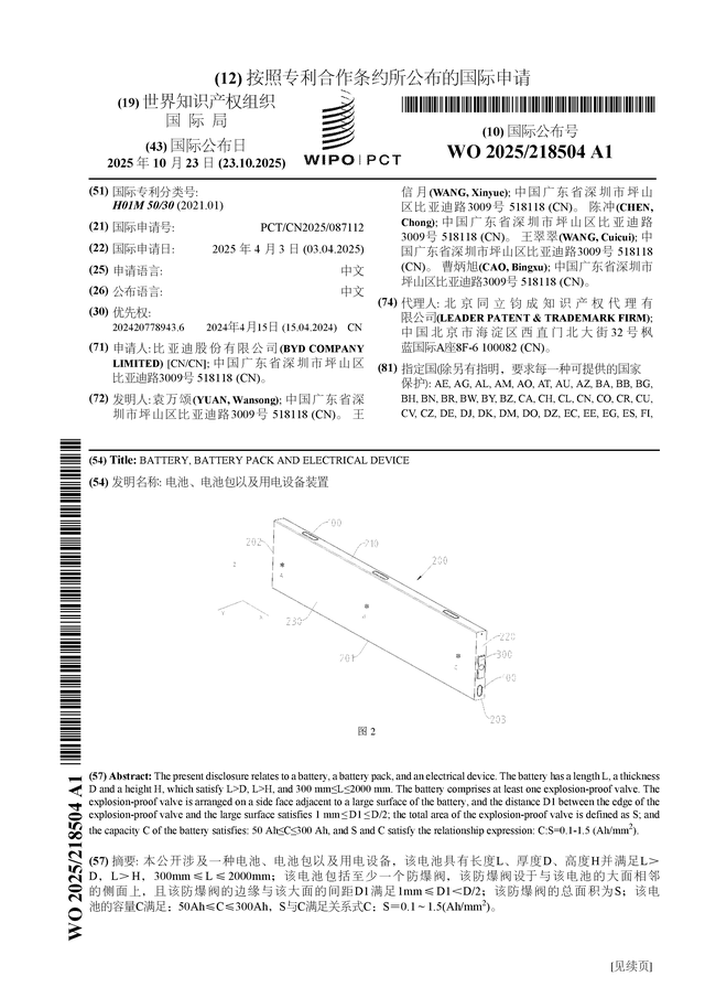 证券之星消息,根据企查查数据显示比亚迪(002594)公布了一项国际专利申请,专利名为“电池、电池包以及用电设备装置”,专利申请号为PCT/CN2025/087112,国际公布日为2025年10月23日。