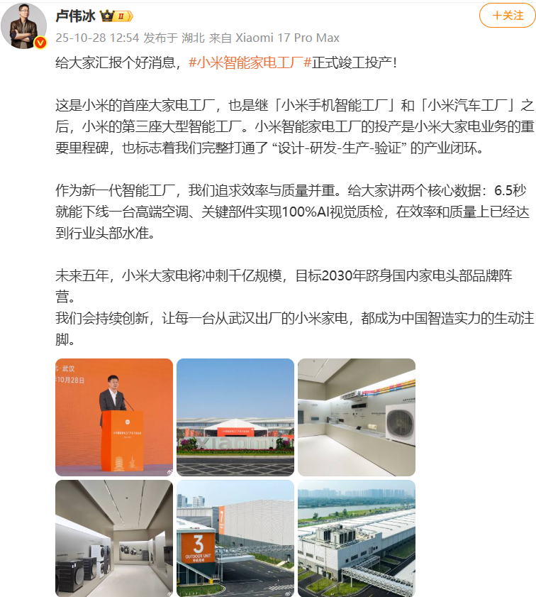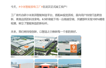 随后,小米集团合伙人、总裁、小米集团品牌总经理卢伟冰发布微博:给大家汇报个好消息,“小米智能家电工厂”正式竣工投产!