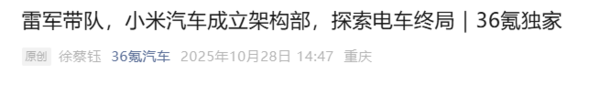 曝小米汽车宣布组织架构调整 雷军领头成立架构部