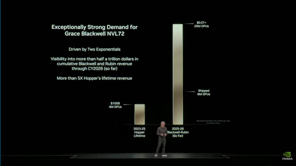 黄仁勋强调,这 5000 亿美元的数字不仅代表着芯片单元的销售,更反映了全球计算基础设施正加速向英伟达的加速计算模型转型,这标志着一个万亿美元计算拐点的到来。