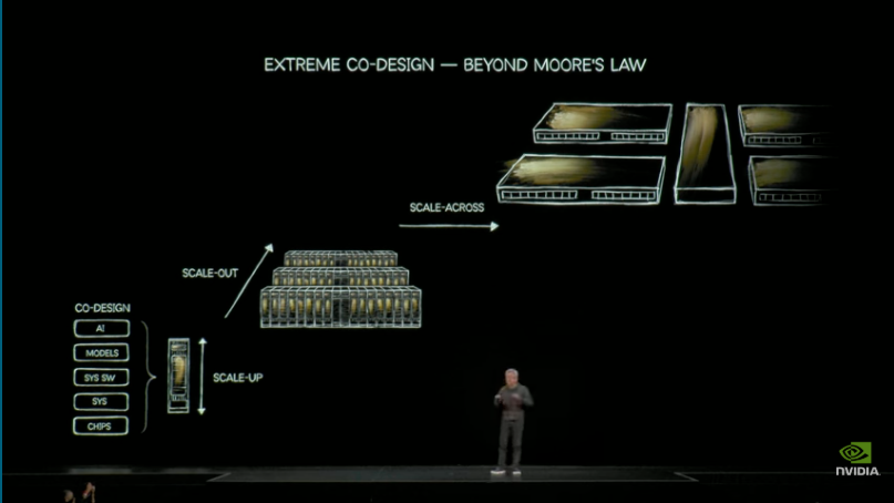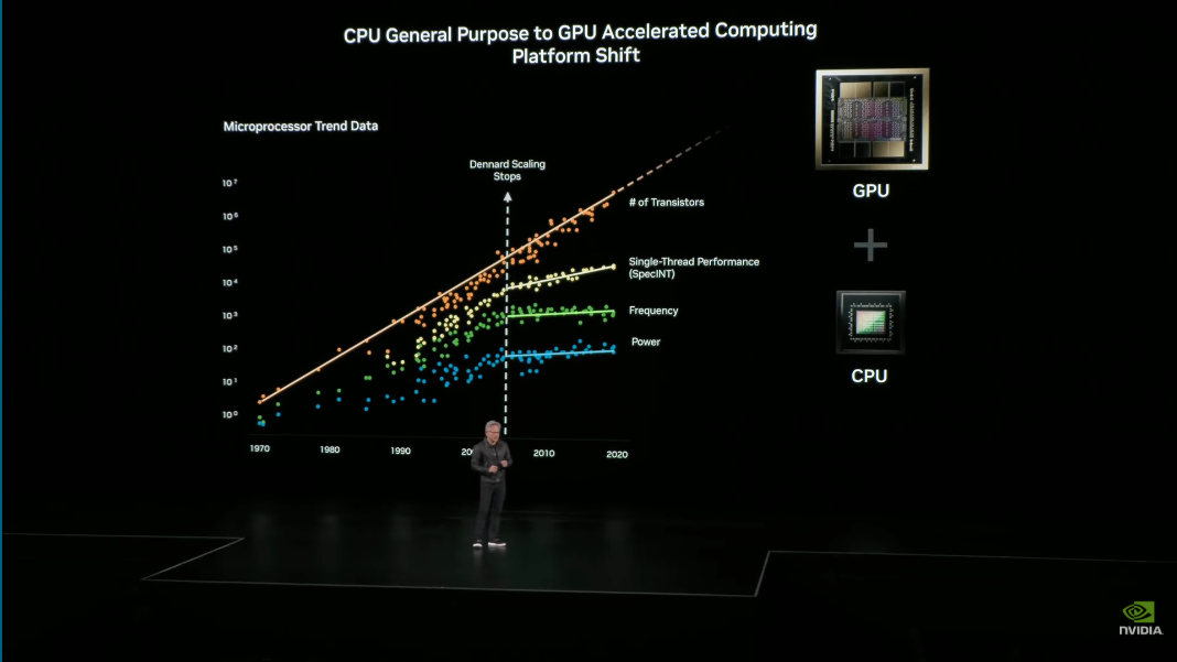 这个观点不新鲜了,但是黄仁勋又强调了一遍。他指出,当前时代的变革始于一个关键观察:Dennard 缩放定律(Dennard scaling)已停止近十年,晶体管的性能和功耗增益受到物理定律的限制,传统摩尔定律的红利正在消退。
