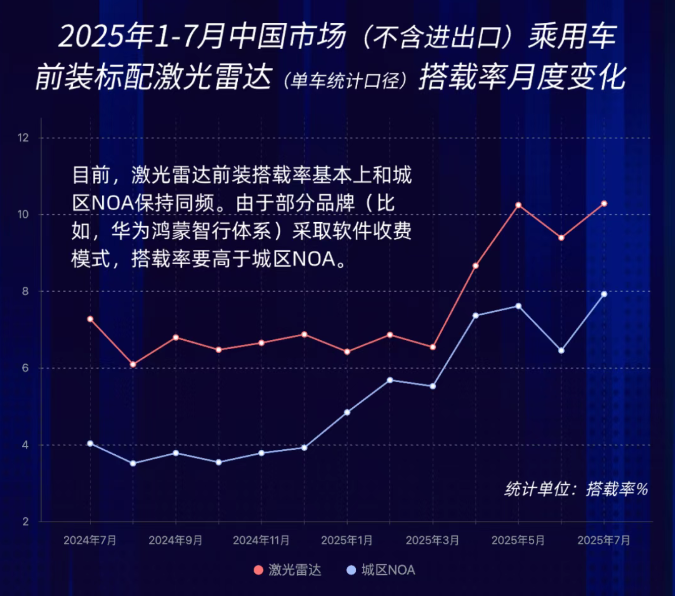 据高工智能汽车数据显示,2025 年 1–7 月,中国市场(不含进出口)标配激光雷达的新车累计交付 104.84 万辆,同比增长 69.73%。其中,20–30 万元区间车型的标配率一度接近 30%。