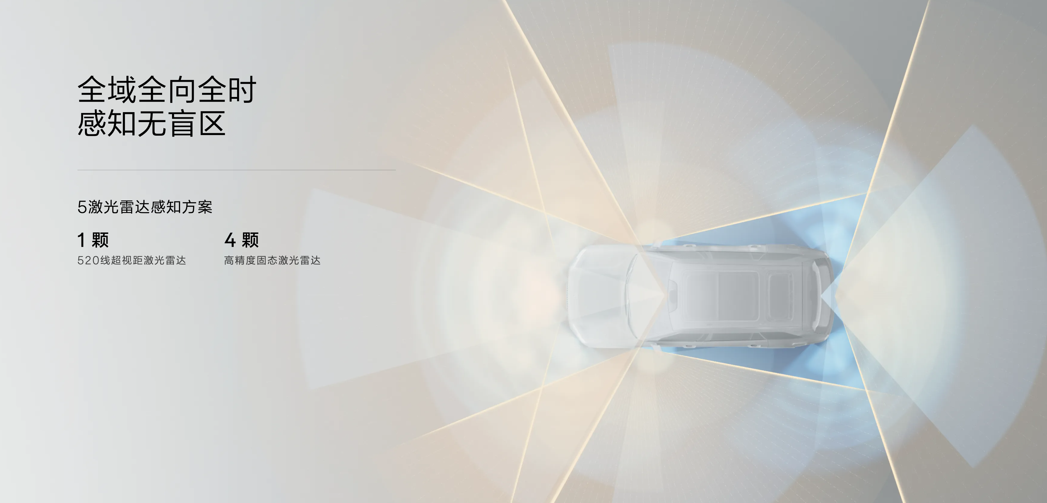 更有部分车型为了提升智驾能力,不再满足于「单雷达」方案。比亚迪仰望 U7 和 U8L 为 3 激光雷达方案,尊界 S800、享界 S9T、问界 M9 搭载了 4 颗,近期发布的极氪 9X 更是采用了 1 颗 520 线长距雷达 + 4 颗高精度固态雷达的配置,实现了 360° 激光雷达全覆盖。
