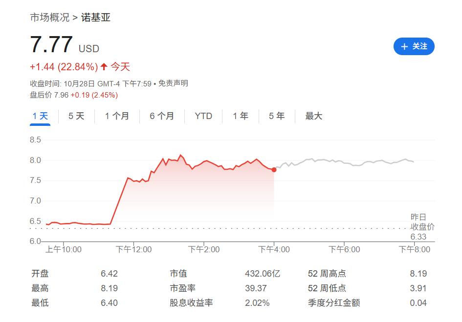 此消息一出,资本市场迅速做出积极反应。诺基亚股价周二收盘飙升超20%,触及2016年1月以来的最高点。与此同时,英伟达股价也录得上涨。