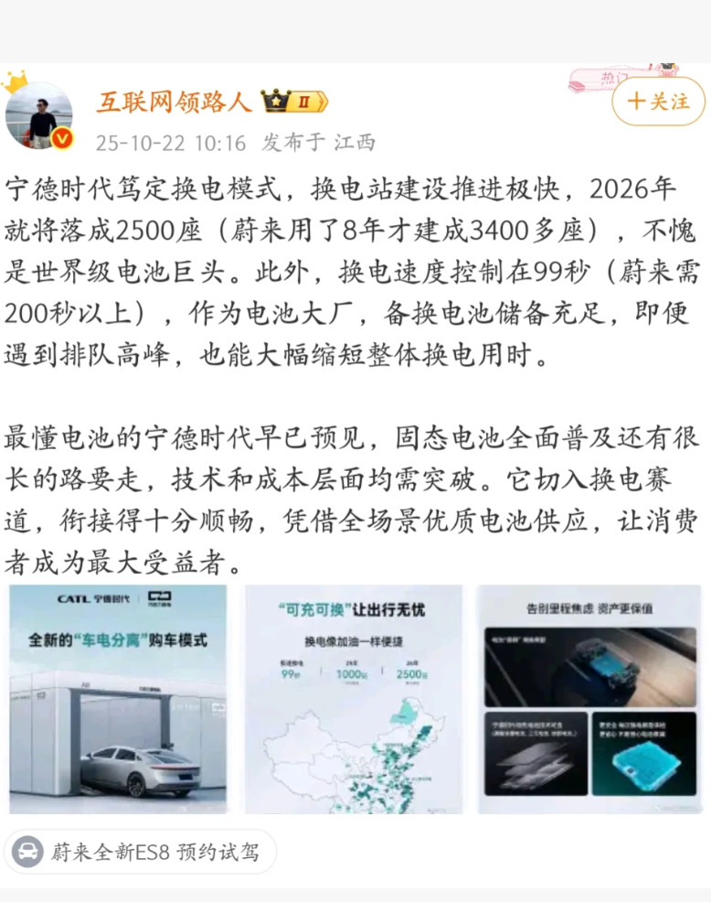 但无论舆论如何摇摆,换电赛道的“双赢”已渐显。宁德的入局,让换电模式从“蔚来独角戏”变成“行业合唱”,加速了基础设施普及,比如未来宁德换电站可能与蔚来互通(已有消息称适配蔚来萤火虫车型),用户能享受更多换电网点;蔚来的技术积累,也为行业树立了“高标准”,比如电池健康管理、安全防护等,倒逼后来者提升技术水平。有网友直言:“不管是宁德的快,还是蔚来的好,建得越多、技术越优,对电车用户都是好事”。