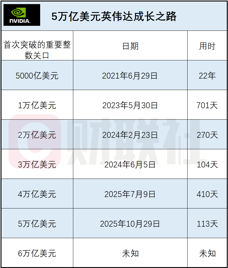 【创造历史!英伟达成为首家市值突破5万亿美元的上市公司】财联社10月29日电,人工智能芯片制造商英伟达公司股价开盘上涨3.2%,市值站上5万亿美元,成为史上第一家市值跨越这一里程碑的上市公司,达到了惊人的5.05万亿美元。英伟达公司总市值从4万亿美元跨越5万亿美元,仅用时113天,而从3万亿到4万亿则耗时410天。高达5万亿美元的总市值,早已超过英、法、德等国家的股市总市值,这一数字正逼近印度股市总价值(5.3万亿美元)。这家总部位于加州圣克拉拉市的公司股价已较4月低点反弹超135%,市值也增加了2.9万亿美元,该公司股价今年已累计上涨54%。