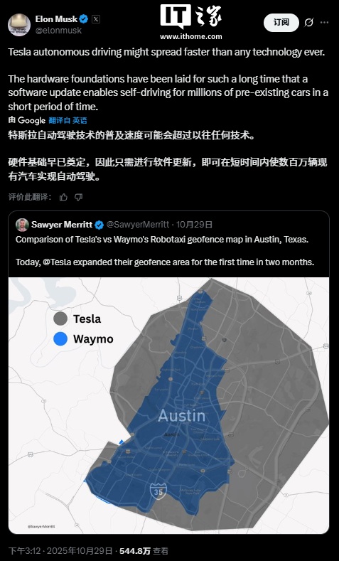 马斯克的上述言论是对行业观察者索耶・梅里特(Sawyer Merritt)所发布内容的回应。梅里特此前发布了一张对比图,展示了特斯拉 Robotaxi 网络与谷歌旗下 Waymo 服务区域的地理覆盖范围。从图表可见,特斯拉在奥斯汀划定的运营区域已明显超过 Waymo 的服务范围。