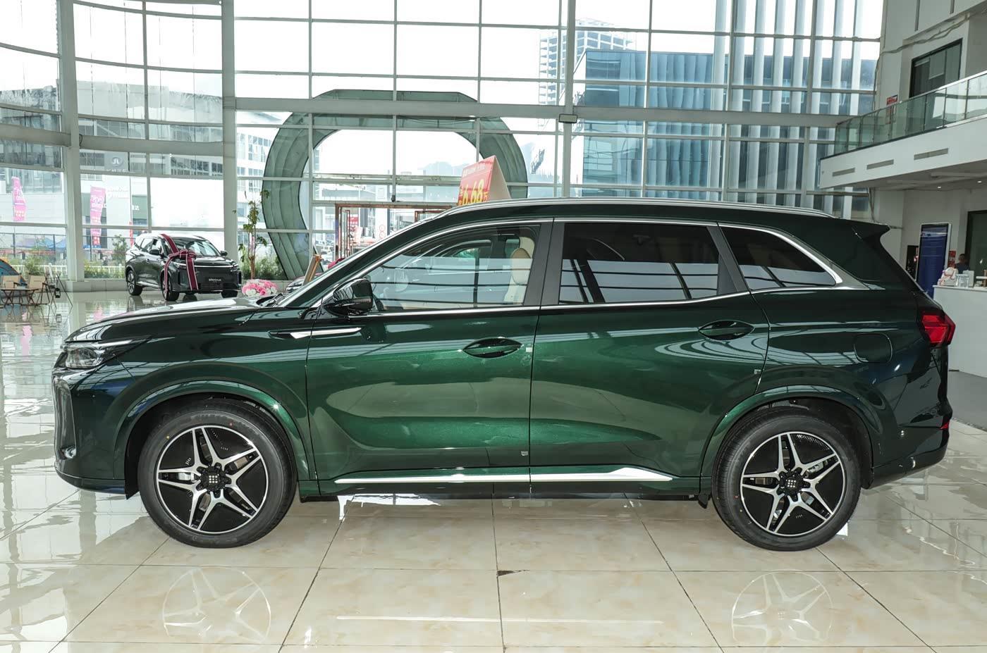 再来看车身侧面部分,作为中型 SUV,车身线条以实用为核心,一条上扬的腰线从前大灯延伸至后尾灯,视觉上拉长车身比例,配合窗框镀铬装饰条与封闭式窗框设计,提升整体质感。18 英寸双色轮毂为中高配专属,轮胎规格兼顾抓地力与滤震需求,而 200mm 左右的离地间隙,使其能轻松应对低附着湿滑路面、鹅卵石路面等复杂路况,通过性接近越野车水平。车身提供极光绿、极夜黑等五种自然光影配色,其中极光绿在不同光线下呈现深邃优雅的质感,深受年轻家庭喜爱。值得一提的是,车门采用较大开口角度设计,配合较低的门槛高度,老人弯腰上车、儿童跨坐入座都更轻松,细节处彰显家用属性。