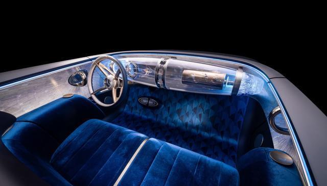 横跨座舱的屏幕中央,四枚时钟中有一枚可化身 AI 伙伴,在交互时展现出拟人化的温度;车门面板镶嵌着珍珠母点缀,银金色调黄铜把手延展成星状图案,搭配深蓝色天鹅绒前排座椅,让人仿佛置身于上世纪 30 年代的豪华列车包厢,而非一款未来感十足的概念车。最令人称道的是车内地板,采用 17 世纪复兴的麦秆镶嵌工艺,以 Art Deco 风格的扇形图案手工打造,让历史艺术在现代座舱中重生。