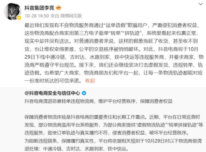 对此,抖音集团副总裁李亮回应称,最近发现有不良物流服务商通过“运单造假”欺骗用户,严重侵犯消费者权益,这些物流商配合商家用第三方电子面单“转单”“拼轨迹”,系统里看起来包裹正常,现实中却并没有送达。他认为,对于普通消费者来说,上述假象拖延收货,甚至收不到货,也让维权变得更难,公平交易秩序被悄悄破坏。