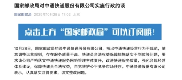 第一件是被国家邮政局约谈。国家邮政局方面指出,中通经营行为不规范,随意调整运营规则,存在服务质量不高、快递员合法权益保障措施落实不到位等问题,要求其严格落实中通快递服务网络管理主体责任,改进快递服务质量,强化合规经营体系建设,保障快递员合法权益,自觉维护公平竞争市场秩序。