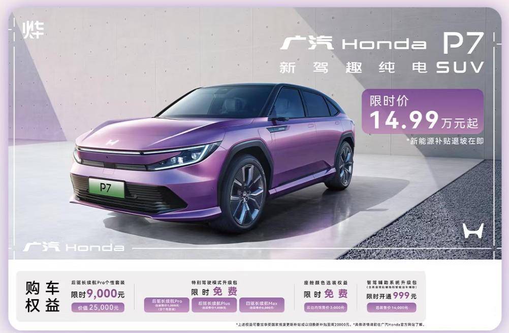 10月28日,广汽本田宣布对旗下纯电中型SUV P7推出限时优惠活动,全系车型直降5万元。起售价从19.99万元降至14.99万元,堪称是广汽本田终于给出诚意的体现。