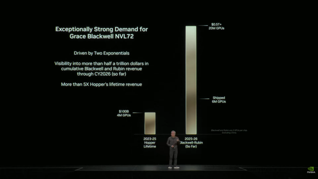 我认为,在Blackwell以及Rubin早期增长态势上,2026年我们很可能是历史上首家能够看到5000亿美元业务规模的公司。正如你所知,2025年尚未结束,2026年也尚未开始。这就是账面上的业务量,迄今为止已达半万亿美元。