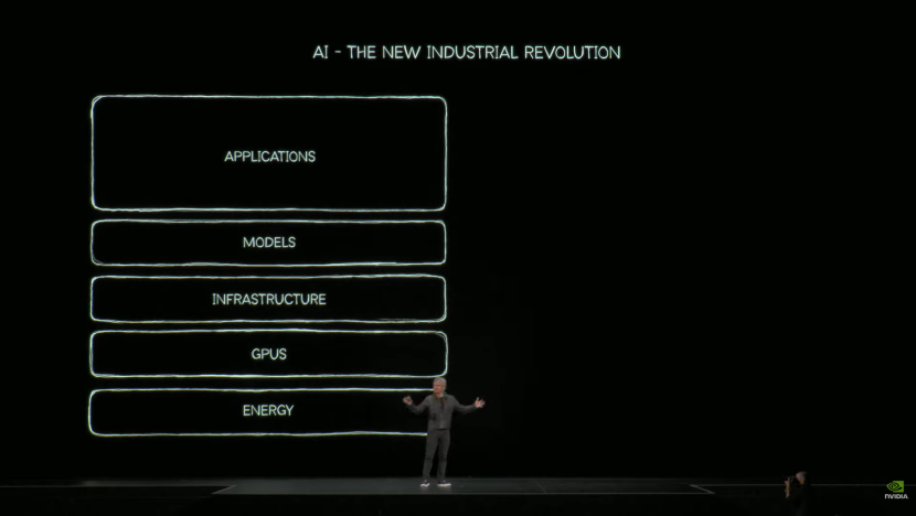 从科技产业的角度来看,这点同样耐人寻味:除了AI作为新兴技术正在开拓经济新领域之外,AI本身也是一种新兴产业。正如我先前所解释的,这个tokens,这些数字,在你将所有不同模态的信息进行分词处理之后,有一家工厂需要生产这些数字。