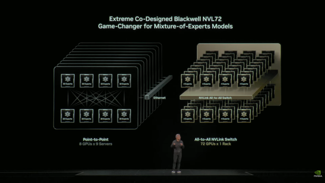 因此,这个价值数万亿美元的巨型AI模型汇聚了众多不同领域的专家。我们将所有这些不同领域的专家都集中到一个GPU上。现在,这是NVLink 72。我们可以把所有芯片都集成到一块巨型晶圆上,每位专家都能相互交流。因此,这位首席专家能够与所有在岗的专家进行交流,以及所有必要的上下文、提示和我们必须处理的大量数据,一堆tokens,我们必须发送给所有专家。专家们会…… 无论哪位专家被选中解答问题,都会随即尝试作出回应。