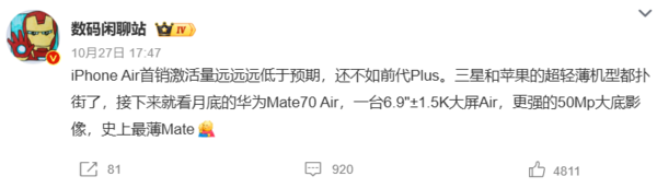 行业人士指出,华为Mate70 Air的推出被视为对苹果iPhone Air等超薄旗舰机的直接回应,起售价预计在4000元-5000元区间。
