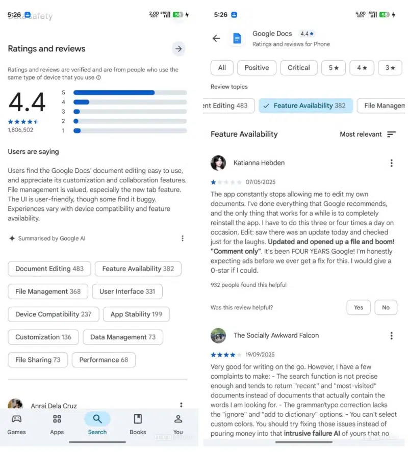 据IT之家了解,当用户查看 Play 商店中的应用页面时,现在会在“评分与评论”板块中看到一个名为“用户评价”的新标题。该标题下方会显示一小段文字,总结用户对该应用的看法。在谷歌人工智能的支持下,这份总结会同时呈现正面和负面评价。