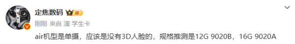 【CNMO科技消息】11月3日,有数码博主曝光了一款Air机型的配置信息。该机型为后置单摄,并且芯片规格或许存在差异。博主推测该机大概率没有3D人脸功能,12GB运存版本可能搭载麒麟9020B芯片,16GB运存版本则可能采用麒麟9020A芯片。从其配置信息来看,CNMO认为该机型大概率为华为Mate 70 Air。