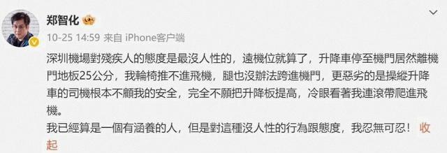10月25日,郑智化的一条微博引爆了舆论,他用“没有人性”、“连滚带爬”这样极具冲击力的词描述了自己在深圳机场登机的经历,在他笔下,自己完全没有得到一个理想的“照顾”,自己轮椅与升降平台之间20厘米的高度差,让自己的尊严被踩的粉碎。