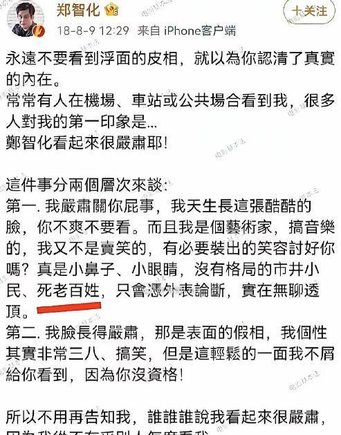 第三问就更简单了,为什么不允许别人犯错,郑智化的表达错误为什么不能被大众理解呢?他并没有借此盈利什么,而哪怕他道歉、清空微博也依旧被人戳脊梁骨,按道理而言,他的这次行为真的应该受到这么严重的惩罚吗?